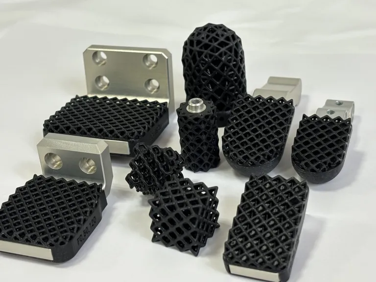 ロボットハンドツール「ラティス構造柔軟指」を提供しています。ラティス構造と呼ばれる立体の格子構造で構成されており、この構造によって耐久性をそのままに「やわらかさ」を実現したロボットハンド用の指先です。従来のロボットハンドと異なり、高い形状ならい性があり、柔軟部が対象の形状に倣って変形、力拘束(つかむ)と形態拘束(つつむ)を同時に発生させて、さまざまな対象を把持できます。