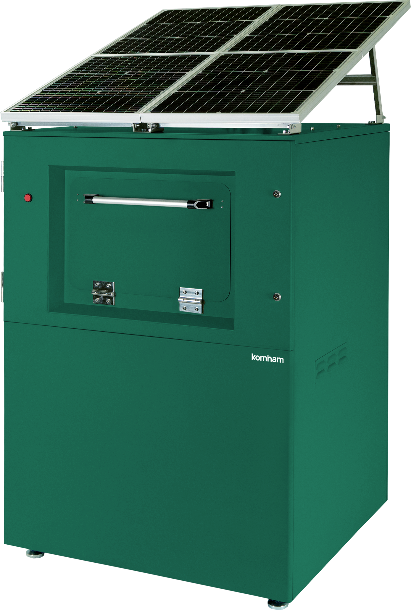 komhamは「スマートコンポスト」と生ごみを分解する微生物群「コムハム」を開発しています。「スマートコンポスト」は、AC電源や排水処理を必要としないソーラー発電で自動駆動する独立型の生ごみ処理機です。生ごみの高速処理が得意な当社微生物群「コムハム」がより安定して生ごみを分解できる環境をスマートコンポスト内に整え、街中や施設内に設置しても景観を損なわないデザインで開発しました。